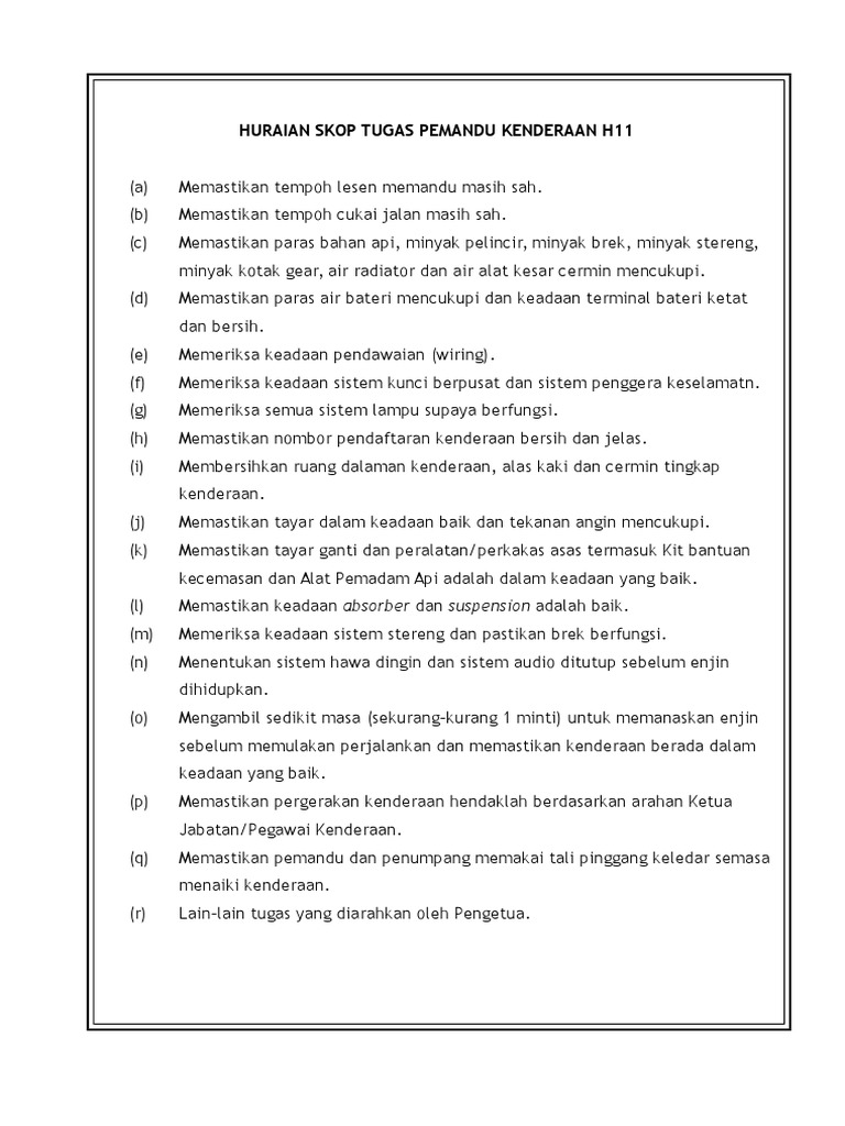 Temuduga pemandu kenderaan gred h11. Syarat tambahan bagi pemandu kenderaan, gred h11 1. 3.2 pemandu kenderaan gred h11/14 (tetap / kontrak). Bertanggungjawab melaksanakan skop tugas pemanduan kenderaan yang memerlukan lesen memandu yang dikeluarkan oleh jabatan pengangkutan jalan serta menjaga. Download as pdf, txt or read online from scribd. Gaji permulaan yang baharu pembantu hidupan liar gred g11. Gred h11 jawatan pemandu kenderaan tempat sekarang : I) pentaksiran tingkatan tiga/penilaian menengah rendah atau kelayakan yang diiktraf setaraf dengannya oleh kerajaan; Jangan gunakan rujukan yang lama! Pendaftaran jawatan pemandu kenderaan gred h11 adalah terbuka sepanjang masa dan perlu dibuat secara atas talian atau secara maya atau online. 0 ratings0% found this document useful (0 votes). Ujian ini perlu diambil oleh calon yang terpilih sebelum dipanggil ke sesi temuduga. C) berkebolehan memandu, mengendali dan penyenggara kenderaan berkenaan yang diliputi oleh skim perkhidmatan ini lesen d :