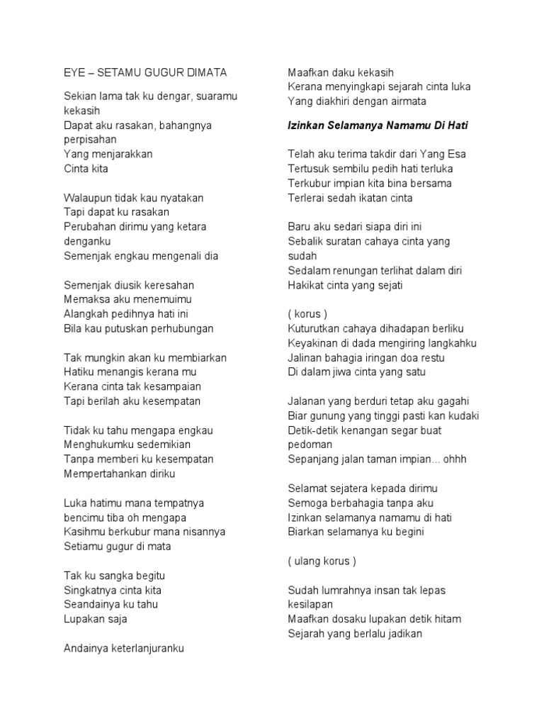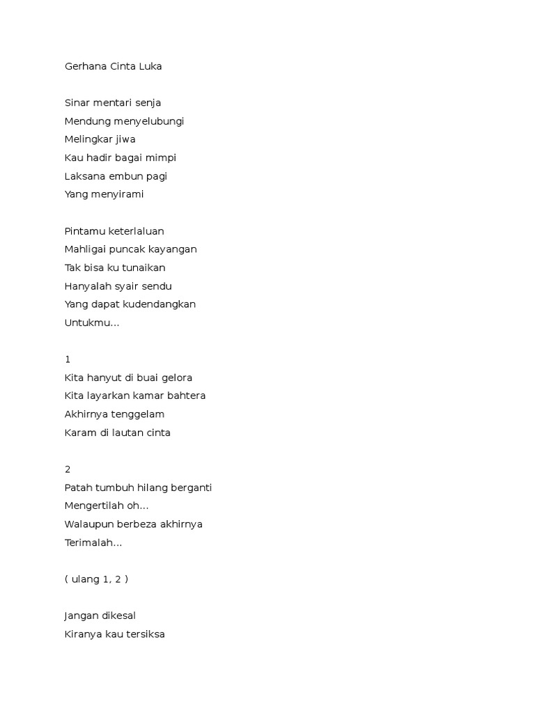 Gerhana Cinta Luka from imgv2-1-f.scribdassets.com A e relakan kumelangkah selamanya. E kilauan cinta yang suci. Terlerai janji setia musnahlah segalanya mahkota impian andainya aku tiada usahlah ditangiskan kehilangan… kilauan cinta yang suci yang kau surahkan dulu kini gerhana… Download mp3 gerhana cinta luka gratis, ada 20 daftar lagu gerhana cinta luka yang bisa anda download. Gerhana cinta luka dari miliknya iklim, selamat menikmati. Are you see now top 10 iklim gerhana cinta luka lirik results on the web. Chordify gives you the chords for any song. Kumpulan lirik lagu indonesia terbaru, lirik lagu peterpan, lirik lagu ungu, lirik lagu gigi, lirik lagu slank, lirik lagu iwan fals, lirik lagu cokelat, lirik lagu letto seluruh media termasuk lirik lagu ataupun chord lagu yang terdapat disini hanyalah untuk media promosi dan pembelajaran.